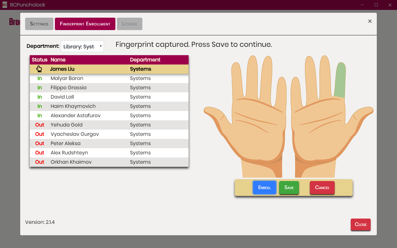 - Once the Fingerprint is captured (after 4 successful scans), Press Save to enroll the finger